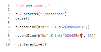 이 문제를 pwntools의 process 모듈을 이용해 코딩하려 했는데, 왜 그런지 모르겠지만 process로 passcode 바이너리를 실행하면 recv를 제대로 받을 수 없고 페이로드를 sendline해도 제대로 먹지 않는 문제가 있었다. 다음과 같이 process로 passcode를 열고 중간에 pause()를 끼워 넣으면 정상적으로 작동하는데,