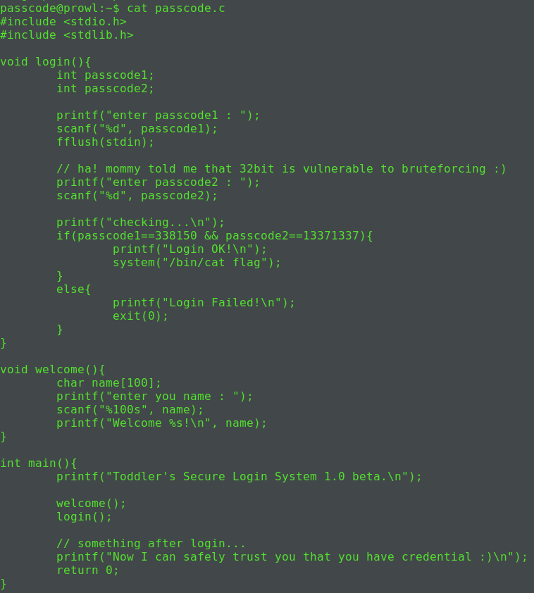 ssh로 접속해 passcode.c를 확인해보면 다음과 같다.