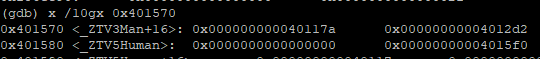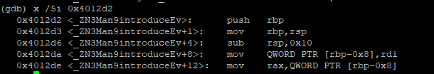 첫줄 부터 보면 앞 부분은 생략 되었지만 rbp-0x38 부분이 man object를 가리키는 주소가 있는 스택 부분이다. 브레이크 포인트를 걸고 이를 gdb로 확인하면 다음과 같다.