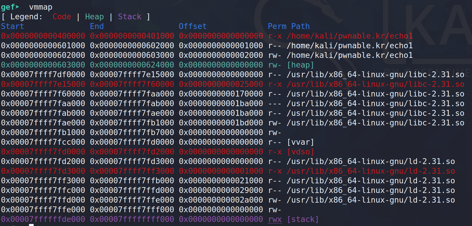 여기서 멘붕에 빠져버렸는데, 왜 kali에서와 pwnable.kr 서버 환경에서의 메모리맵이 다른지 그 이유를 알 수가 없었다.