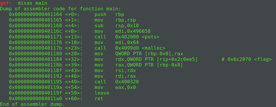 gdb를 flag로 디버깅해보면, 아래와 같이 malloc을 수행한 뒤 해당 메모리 영역에 flag 값을 복사해 넣음을 알 수 있다. 따라서 0x401184 부분이 실행 되면, flag 값이 rdx 레지스터에 들어갈 것이라고 예측할 수 있다.
