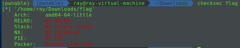 flag를 메모리에 복사해 놨으니 가져 가란다. 그런데 바이너리가 패킹 되어 있을 것 같다. checksec으로 확인해보면 다음과 같이 바이너리가 UPX 패킹 되어 있음을 알 수 있다. UPX로 바이너리를 언패킹하면 원본 바이너리를 얻을 수 있다.